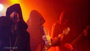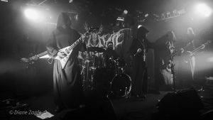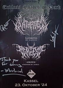 Was für zwei intensive depressive/atmosphäric Black Metal Bands. Den Auftakt machten Xathrites aus dem Irak. Leider konnten zwei Bandmitglieder nicht mitreisen, weil sie vom Irak nach Ägypten ausgewandert sind und die Papiere noch keine Gültigkeit hatten. So kamen diese Parts vom Band und sie standen zu dritt auf der Bühne: Sänger, Gitarrist, Songwriter, Texter und Produzent Whirlwind, Bass Wendigo und Schlagzeuger Ronce. Unglaublich fesselnd, ein melancholischer, gefühlsechter Auftritt zum Dahinschmelzen. Ich bekam noch eine handgeschriebene Setlist, weil sie keine feste Struktur haben und es bei jeder Show variiert.
