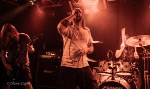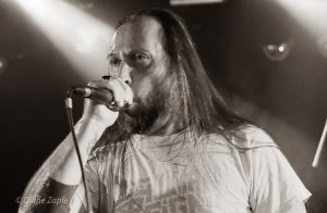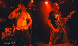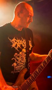 Als Headliner betraten Defeated Sanity die kleine, feine Goldgrubenbühne und wir wussten – jetzt wird es ernst. Seit 1993 aktiv, gegründet von dem mittlerweile verstorbenen Jazz-Schlagzeuger Wolfgang Teske und seinem Sohn Lille Gruber, gilt die Band als einer der komplexesten und innovativsten Vertreter des Technical Brutal Death Metal weltweit. Heute ist Defeated Sanity ein transatlantisches Projekt mit Mitgliedern aus Deutschland und den USA. Ein Paradebespiel für brutale Musikalität auf höchstem Niveau. Kein Wunder, dass Sanguisugabogg sich die Band für einen gemeinsamen aktuellen Song ausgesucht hat:“Abhorrent Contraception“. Was folgte, war ein technisch präziser, fast schon surreal brutales Set voller rhythmischer Brechungen, Fingerverknotungs-Gitarrenriffs und gutturaler Vokalakrobatik in tiefste Tiefen. Das Schlagzeugspiel eines Lille Gruber ist nicht nur schnell, sondern intelligent, kontrolliert und absolut brilliant. Die fast ausverkaufte Grube verwandelte sich schnell in eine überhitzte, brodelnde Sauna und den Fans stand zum Schluß die Faszination über diesen harten wie genialen Gig ins Gesicht geschrieben.