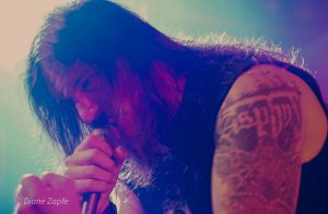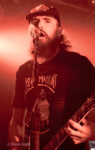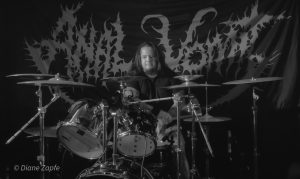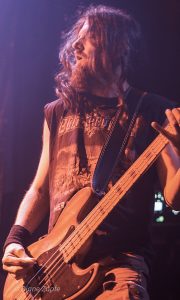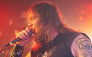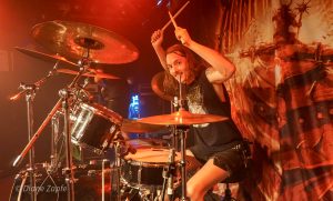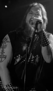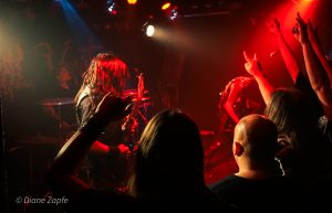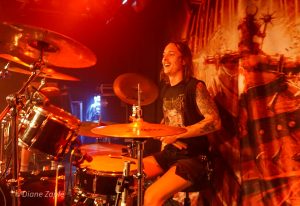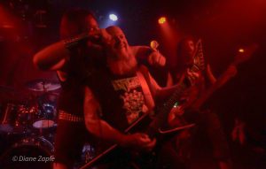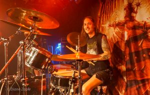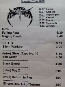 Davon profitierte natürlich sofort die Vorband, die extrem gut ablieferte. Total Annihilation aus Basel/Schweiz haben mit ihrer Mischung aus Thrash- und Death-Metal die Bühne regelrecht zerlegt. Seit 2006 aktiv und mit dem zuletzt erschienen Album …On Chains Of Doom(2020) unterwegs, zeigten sie eindrucksvoll, dass sie weit mehr sind als ein Opener. Daniel Altwegg brüllte sich die Seele aus dem Leib, während Nicolas Stelz an der Leadgitarre mit messerscharfen Soli glänzte. Jürgen Schmid und Niggi Denger lieferten das groovende Fundament, doch das wahre Kraftwerk saß hinterm Schlagzeug: Michael Lautenschläger. Leider kaum sichtbar hinter seinem wuchtigen Drumkit. So sehr, dass ich ihn nach der Show um ein paar Fotos direkt am Set bat. Total Annihilation haben den Abend nicht nur eröffnet, sie haben ihn überrollt. Die Zugabe gab es bei Krach aus dem Publikum – kein Problem. So wurde noch das schnelle und harte „The Art of Torture“ geknüppelt. Applaus und Gejubel.