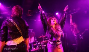 …und so startete der Abend ruhig und in bester Gesellschaft. Heiko und Markus hatten auch mal wieder den Weg nach Kassel gefunden, aber nur Markus sollte gefallen, was nun kam. VIOLET, eine 80ziger Jahre Glam, Rock, Heavy, Pop – ich weiß nicht was – Band mit Frontfrau. Die Fans standen direkt hinter mir und gaben die Songs ungebeten in einem schrägen Gekrächze von sich, während sich die Band auf der Bühne vorbereitete. Auch auf freundliche Hinweise, man möge die Songs doch lieber im Original von der Sängerin vorgetragen haben, kam nur, man wäre eh schon zu besoffen. So konnte man nur anstoßen und ein Bierchen mittrinken. PROST! Das Outfit der Band stammte auf jeden Fall 1:1 aus den 80ziger Jahren. Sängerin Jamie führte das Set an und stand in permanenter Interaktion mit dem Publikum. In Markus hatten sie auch einen neuen Fan gefunden, der sich nicht nur ein Bandshirt kaufte, sondern uns stolz das Selfie mit der Sängerin zeigte.