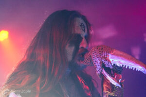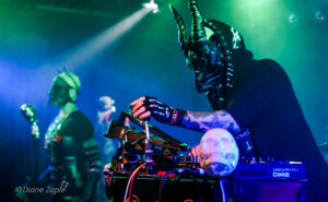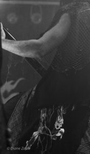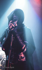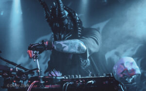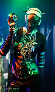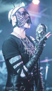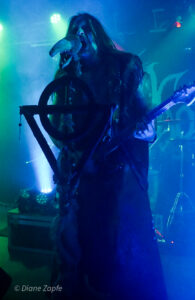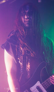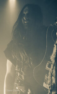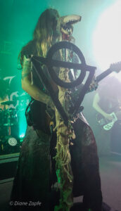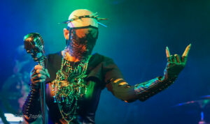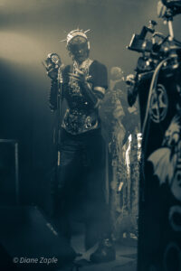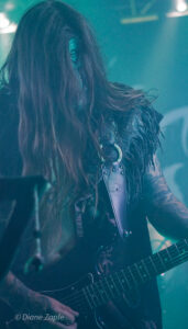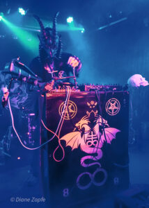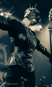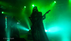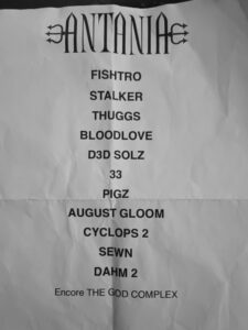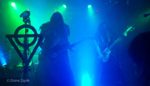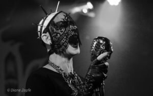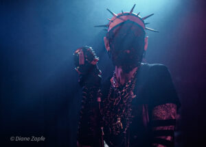 Am Dienstagabend wurde die Goldgrube in Kassel zum Schauplatz eines intensiven und atmosphärisch dichten Konzertabends – leider vor nur wenigen Zuschauern, die jedoch Zeugen eines besonderen Erlebnisses wurden. Den Auftakt machten Antania, ein ungewöhnliches Doom-/Bassdrum-Duo mit starkem Gothic-Einfluss. Die Formation, die ihre stilistisch und minimalistische Musik selbst als AGGROTECH Doom Metal beschreibt mit industrial und elektronischen Einflüssen, bestand lediglich aus einer Sängerin und einem Musiker, der sich um elektronische Drums und Sound kümmerte. Letzterer hatte sich dafür eigens einen Stand auf der Bühne aufgebaut, von dem aus er das Klangbild steuerte. Die Sängerin erschien zunächst komplett in Schwarz gehüllt: mit einem weiten Tuch um den Kopf und einer schwarzen Spitzenmaske vor dem Gesicht. So geheimnisvoll und fast sakral wirkend. Im Laufe des Sets legte sie das Tuch ab und setzte sich eine strahlenförmige Krone auf, die an die Freiheitsstatue erinnerte und ihre Erscheinung noch eindringlicher machte. Ihr leicht krächzender, rauer Gesang verband sich hervorragend mit den treibenden Bass- und Drum-Rhythmen. Stücke von ihrem Album The God Complex sorgten für einen intensiven Einstieg in den Abend – ein mehr als gelungener Opener.