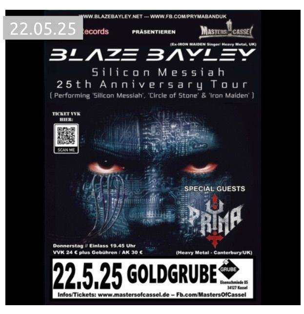 Nach den großartigen Auftritten im August 2022 und Mai 2024 beehrt uns die Metal-Legende BLAZE BAYLEY – der ehemalige Sänger von IRON MAIDEN und WOLFSBANE – am 22. Mai 2025 erneut in der Goldgrube. Auf seiner „Sillicon Messiah 25th Anniversary“ European Tour wird BLAZE zum dritten Mal die Kasseler Goldgrube rocken. Im Vorprogramm zockt die britische Band PRYMA als Support.