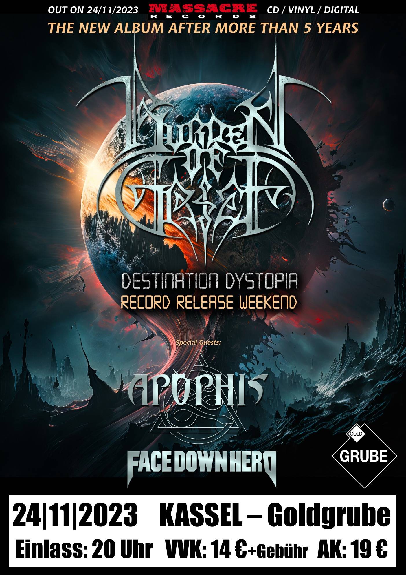 Das erste Album nach mehr als 5 Jahren. Verstärkt durch die beiden neuen Bandmitglieder Dominik Hellmuth (Gitarre) und Manuel Lüke (Schlagzeug), die ebenfalls in der HM-2-Death-Metal-Horde NIGHTBEARER aktiv sind, erscheint am 24.11.2023 das stärkste, härteste und abwechslungsreichste Album in der fast 30-jährigen Bandgeschichte. BURDEN OF GRIEF haben es geschafft, sich auf ihre jahrelange Erfahrung zu konzentrieren, ihre Stärken zu bündeln und sie in 10 Riffmonstern zu packen, die vor Energie, großartigen Melodien und purer Härte nur so strotzen. Produziert von Kristian „Kohle“ Kohlmannslehner in den Kohlekeller Studios (Hämatom, Powerwolf, Aborted,…) wartet „Destination Dystopia“ mit der fettesten und professionellsten Produktion der gesamten Bandgeschichte auf, und neben alten Songs wird es an diesem Abend natürlich auch viel neues Material zu hören geben.