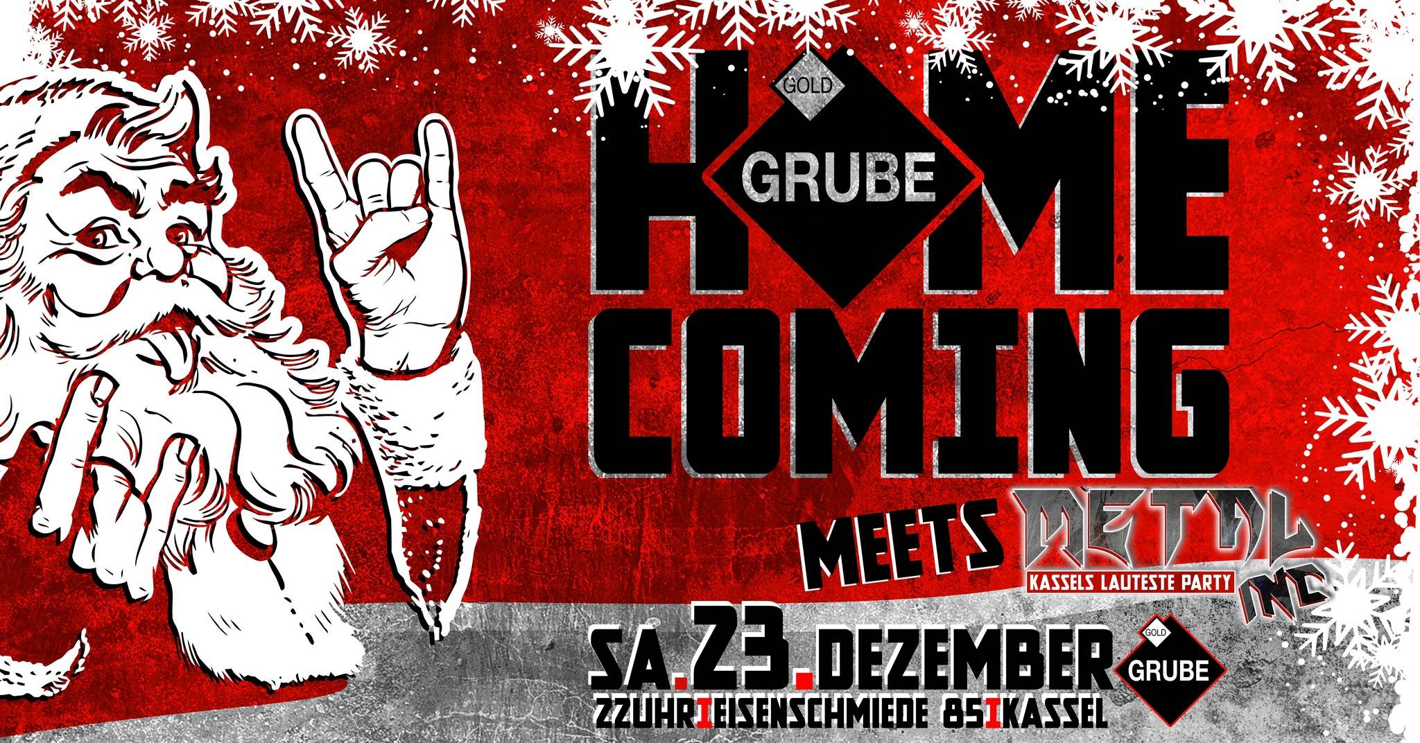 Hohoho! Was hat der Weihnachtsmann denn da angeschleppt? Nichts anderes als die zweite offizielle Homecoming in der Goldgrube Kassel. Das traditionelle vorweihnachtliche Zusammenkommen in unserer schönen Stadt für alle Auswärtigen und Daheimgebliebenen kommt dieses Jahr wieder in euren Lieblingsclub. Und um das Ganze musikalisch einzugrenzen, trifft das fröhliche Beisammensein auf das Programm der Metal Inc.