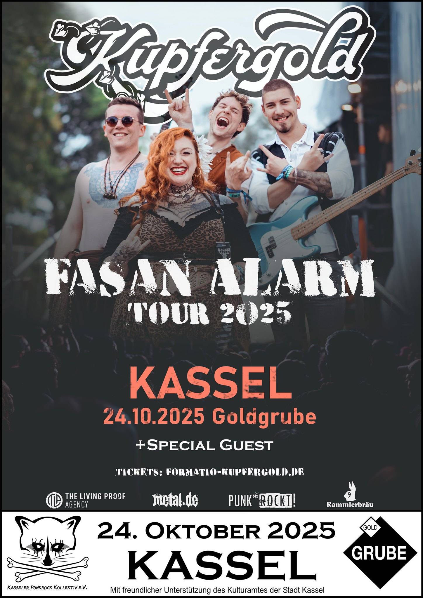ALARM! ALARM! Kupfergold veröffentlichen im Sommer ihr neues Album und gehen damit im Herbst auf die FASAN ALARM TOUR 2025 *üh-üüh* – denn wahre Fans haben schon lange akzeptiert, dass eine Kupfergold Show ohne Fasanenrufe keine Kupfergold Show ist. Klar, soweit? Klar soweit. Macht euch gefasst auf 14 mal Kupfergold in Deutschland und erstmals als Headliner auch in Österreich.