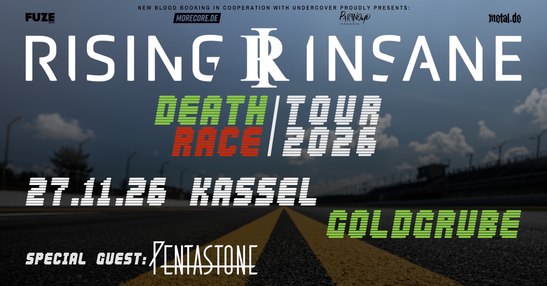 Die norddeutsche Metalcore-Formation Rising Insane startet mit Vollgas ins Jahr 2026 und kündigt nach ihrer aktuellen Single, ihre neue Headline-Tour an. Die „Deathrace Tour 2026“ führt die Band im November und Dezember quer durch Deutschland. Der exklusive Eventim Pre-Sale beginnt am Freitag, 13.03., um 11:00 Uhr, der allgemeine Vorverkaufsstart folgt am Montag, 16.03., um 11:00 Uhr über alle bekannten Vorverkaufsstellen.